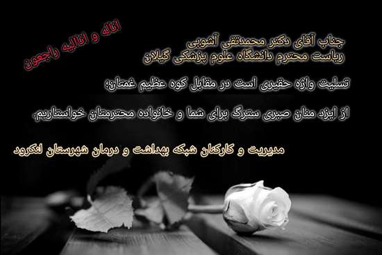 "جناب آقای دکتر محمدتقی آشوبی، ریاست دانشگاه علوم پزشکی گیلان" با نهایت تآسف و تاثر درگذشت مادر گرامیتان را خدمت جنابعالی و خانواده محترم، تسلیت عرض نموده و از درگاه ایزد منان برای آن عزیزسفر کرده، غفران واسعه الهی و برای بازماندگان صبر جمیل مسالت داریم./ص