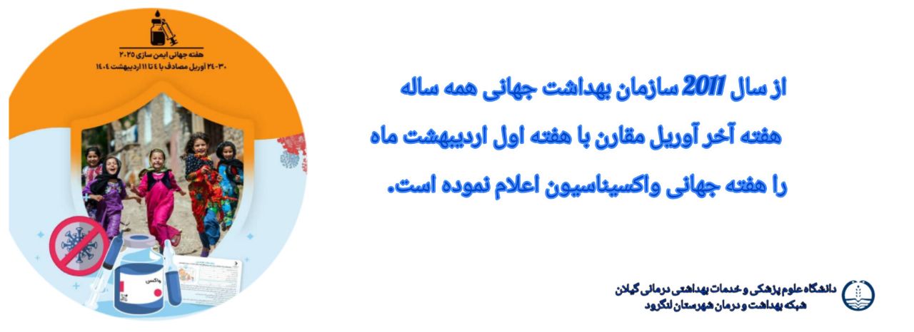 هفته جهانی ایمن سازی مصادف با 4 تا 11اردیبهشت 1404 با شعار " ایمن سازی برای همه انسانها، امکان پذیر است" و این هفته یک فرصت برای مرور یکی از بزرگترین دستاورد برای بقای بشریت است و واکسن ها یکی از بزرگترین دستاوردهای بشریت در عرصه سلامت  هستند و طی 50 سال گذشته، واکسن های ضروری حداقل جان 154 میلیون نفر را در دنیا نجات داده اند.واکسیناسیون از سال 1974 تاکنون در هر دقیقه، جان 6 نفر را نجات داده است و واکسن ها در برابر بیش از 30 بیماری تهدید کننده زندگی از انسانها محافظت می کنند.